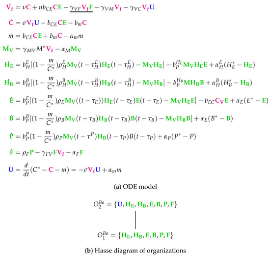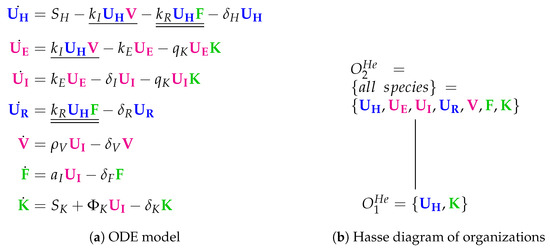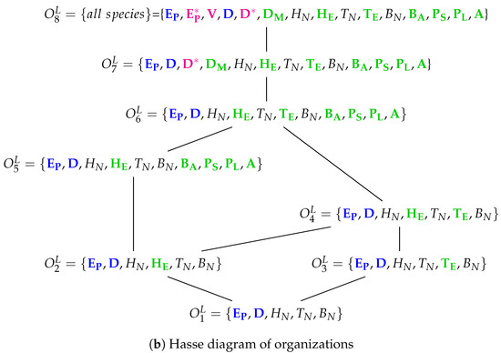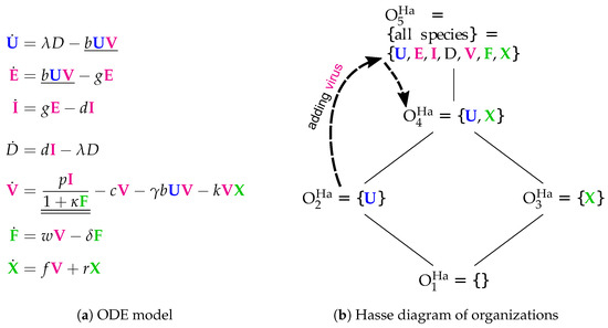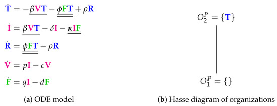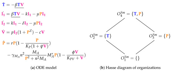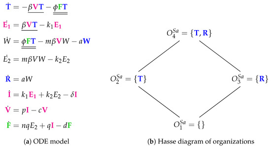Figure 6b shows the Hasse diagram of organizations. The smallest one is the empty set. The biggest one is , which contains susceptible target cells T and bacteria P. It represents an organism without viral but with bacterial infection. Between those two extreme organizations, we find and . Thus, represents the healthy organism without any infection. could mark the state after a viral-bacterial co-infection: after viral infection and because of the death of all target cells as well as all viruses only bacteria remain.