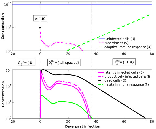 Temporal dynamics of the Handel model. By projecting the seven-dimensional trajectory to organizations (dotted arrows in Figure 7b) we find three phases: (Phase 1) Until day number 0, there are solely uninfected cells in the system represented by the organization . (Phase 2) At day 0, infection is simulated by adding virus particles to the system. The resulting state is projected to organization (all species). (Phase 3) Lastly, at day t = 37d past infection the system settles in the final organization, namely , which is generated by the set (see text). The values of the model parameters are (from [24]): , , , , , , , , , , , , and . Note that the number of uninfected cells is not constant after infection as it may seem from the figure. In fact, after infection, the number of uninfected cells first decreases and than rises again [24].