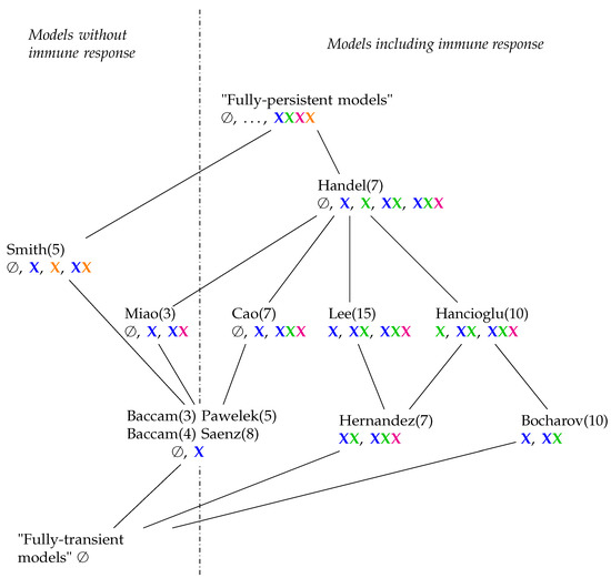 In order to construct a hierarchical map of all investigated models, we characterize a model by a signature of organizations, which is a set of organization types. For example, the signature of the Handel Model (Figure 7b) is the set . An organization type like means that there is at least one organization that contains uninfected (target) cells () and species of the active immune response . The deviation of the signatures for all models is shown in Table 1. Note that we ignore species colored black. We include the empty set ∅ because this distinguishes models without any inflow from those that possess an inflow of some species.