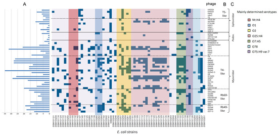 Analysis of the lytic behavior of isolated phages on a set of 64 Escherichia coli strains from various serotypes. Blue squares indicate plaque formation of a given phage. The number of strains that were successfully lysed by a given phage are shown in (A). Order of the phages (y-axis) is based on morphology (C) and taxonomic classification (B), respectively. The order of E. coli strains is based on determined serotypes. As there are many T4-like and T5-like phages in our study, phages T4 and T5 were also included in this analysis.