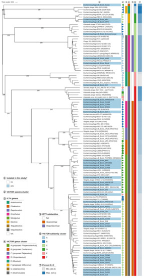 - Adriaenssens, E.M.; Wittmann, J.; Kuhn, J.H.; Turner, D.; Sullivan, M.B.; Dutilh, B.E.; Jang, H.B.; van Zyl, L.J.; Klumpp, J.; Lobocka, M.; et al. Taxonomy of prokaryotic viruses: 2017 update from the ICTV Bacterial and Archaeal Viruses Subcommittee. Arch. Virol. 2018, 163, 1125–1129. [Google Scholar] [CrossRef] [PubMed]