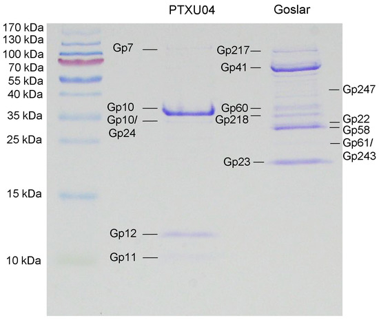 SDS-PAGE profile of structural proteins of phages PTXU04 and Goslar and identification via mass peptide fingerprinting. Proteins were separated by 15% SDS-PAGE. After extraction of gel bands and tryptic digestion, samples were analyzed via peptide mass fingerprinting. Identified gene products are shown.