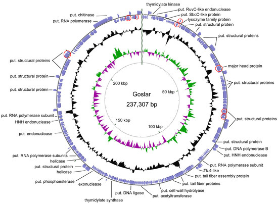 Sequencing of phage Goslar resulted in a genome size of 237,307 bp (GC content of 46.53%), classifying it as a jumbo phage. In this case, treatment with exonuclease BAL-31 and subsequent hydrolysis with different restriction enzymes showed that the genome of this phage appears to be circularly permuted. Annotation led to the determination of 249 predicted CDS, but no tRNAs (Figure 10). Though comparison at the nucleotide level resulted in only a small number of short stretches of similarity to other phages, BLASTP analysis gene by gene and hmmscan using the pVOG database revealed several shared conserved domains and similarities to other phages, so that a rough characterization of the genome organization could be performed. Thus, we identified putative genes involved in replication, e.g., a DNA ligase and helicase, in nucleotide metabolism, e.g., a putative thymidylate synthase, and a chitinase, which may be involved in host lysis. Based on the number of hits in the BLASTP analysis, we chose phages from GenBank for further analysis with CoreGenes3.5 [44,45]. Thus, we identified non-Escherichia phages that shared at least more than 70 homologs with phage Goslar, namely Pseudomonas phages phiKZ (77), PhiPA3 (79), Phabio (77), and Noxifer (84), Erwinia phages vB_EamM_ChrisDB (76), PhiEAH1 (83), and Ea35-70 (91), and Ralstonia phage RSL2 (75).