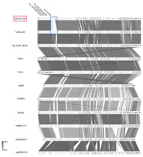 Based on their striking C3-like morphological features displaying elongated capsids at first hand and also on genomic and proteomic approaches, the genus Kuravirus was created by the ICTV and consists currently of six officially classified members (Figure 9), including already published phages phiEco32 [41], vB_EcoP_SU10 [40], NJ01 [46], and ECBP2 [47]. Generally, after our analysis, all suggested members had a genome size of about 77 kb (average GC content 42.2%), encoded about 74 proteins, and revealed 0-1 tRNAs with the exception of phages LAMP (MG673519) and myPSH2311 (MG976803), which have smaller genomes of about 68.6 kb. Overall, the ends of the WFI101126 genome were adjusted based on PhiEco32 and vB_EcoP_SU10, which revealed the strongest similarities (VICTOR similarity of 92.1%; see Supplementary Table S5). A synteny plot of different kuraviruses (Figure 11) showed that they all have nearly the same genome organization apart from small differences. One major difference of WFI101126 is the organization of the cluster for putative tail fibers. While all other phiEco32-like phages seem to have several genes encoding tail-fiber-associated proteins, WFI101126 seems to harbor one less (WFI101126_0001212, marked in blue). Altogether, our analysis of WFI101126 isolated in this study compared to other related phages clearly classified it and four other phages as members of this distinct genus.