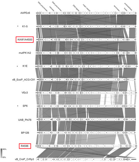 - Chang, H.W.; Kim, K.H. Comparative genomic analysis of bacteriophage EP23 infecting Shigella sonnei and Escherichia coli. J. Microbiol. 2011, 49, 927–934. [Google Scholar] [CrossRef]