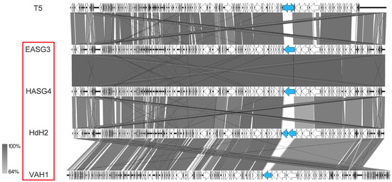 Several new T5-like phages have been isolated from different habitats and studied in recent studies [19,20]. In our study, we also identified four phages closely related to Escherichia phage T5. All of them were isolated from samples associated with different birds. While phages HdH2 and HASG4 were identified using chicken feces, phages EASG3 and VAH1 were isolated from duck and budgie droppings, respectively. In regard to their sequence, the genome sizes ranged between 120 and 124 kb, displaying the characteristic T5-like terminal repeats of about 10–11 kb and 21–24 tRNA genes. Major differences were again detected in the region for genes involved in adsorption, in particular in the gene for the L-shaped tail fiber of T5, which is exchanged in the other phages (Figure 13, marked in blue). While the homolog in EASG3 and HASG4 revealed similarities to a tail fiber gene from Salmonella phage SP1a, HdH2 harbored two genes for tail-fiber-like proteins similar to Salmonella phage Sw2. Further differences were also identified in the gene for the T5 straight tail fiber (T5.140) and the receptor binding protein (T5.157), which might be the reason for different host ranges of the T5-like phages of our study.