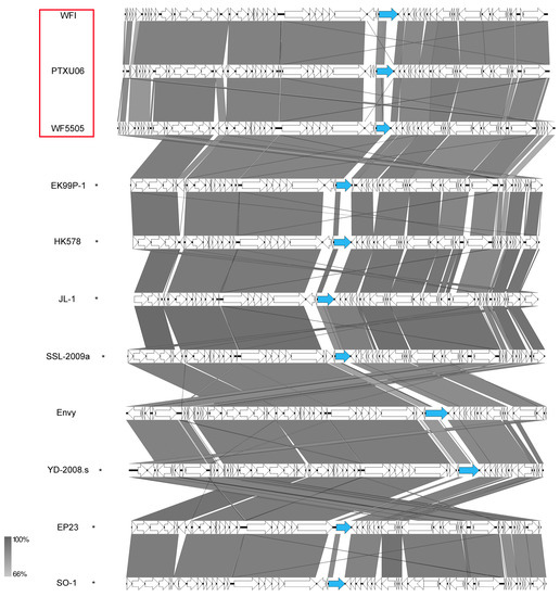 - Sullivan, M.J.; Petty, N.K.; Beatson, S.A. Easyfig: A genome comparison visualizer. Bioinformatics 2011, 27, 1009–1010. [Google Scholar] [CrossRef] [PubMed]