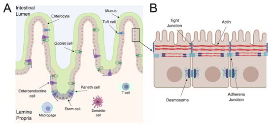 The GI epithelium has villus and crypt structures that influence the morphology of the intestine (Figure 1A). The villi project into the intestinal lumen and are mainly composed of enterocytes with other cell types scattered throughout the villi. The base of the crypts contain stem cells that are responsible for the renewal of all the cell types of the GI epithelium [,]. The LGR5+ stem cells at the base of the crypt are lined by Paneth cells, which are critical for maintaining stem cell homeostasis (growth factor production) and the secretion of antimicrobial peptides [,]. Other cell types are also critical for stem cell differentiation, including crypt-specific fibroblasts []. In addition to stem cells and Paneth cells, the epithelium is composed of at least six distinct cell types that help execute the barrier’s essential functions. The cell types can be broken into two main subgroups: those of absorptive and secretory lineages. The absorptive lineage is comprised mainly of enterocytes and microfold (M) cells. M cells are grouped into the absorptive lineage due to their role as conduits between luminal contents and immune cells in the lamina propria and Peyer’s patches []. The secretory lineage includes enteroendocrine cells, Paneth cells, and goblet cells []. As the name suggests, cells comprising the secretory lineage mainly secrete proteins into the lumen of the GI tract. Goblet cells produce and secrete mucus, which covers the epithelium and has a protective function against pathogens []. On the other hand, enteroendocrine cells produce hormones that are thought to provide signals to stem cells. Each cell type is responsible for separate functions to maintain homeostasis of the GI epithelium. Without each cell type, the delicate balancing act of protecting against pathogens, maintaining correct equilibrium with the microbiome, and the absorption of nutrients would be disrupted.