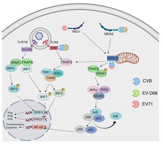 The adaptor protein for both RIG-I and MDA5 is the mitochondrial antiviral-signaling protein (MAVS), which is localized to the mitochondria and peroxisomes. When RIG-I or MDA5 are activated by dsRNA, the CARD domains become ubiquitinated [,], leading to the formation of MAVS aggregates in the mitochondrial membrane []. Aggregation of MAVS leads to the activation of NF-κB and IRF3, which then induce IFN []. In vitro studies have concluded that overexpression of MAVS can inhibit CVB3 replication by increasing the amount of IFN induction []. Although some studies have showed that MAVS deficient mice do not have an increased CVB3 viral load compared to WT controls, these animals succumb to infection much earlier than WT animals, suggesting that MAVS signaling and MDA5 dependent activation of IFN is imperative to host response to infection []. Overall, these PRRs and adaptor molecules have been shown to be imperative for sensing enterovirus infections.