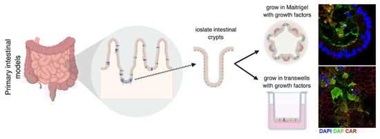 Primary intestinal models to study enterovirus infection. Intestinal crypts are isolated from the small intestine and plated either in Matrigel or on transwells. Crypts plated in Matrigel form a 3D structure called enteroids. When plated in Matrigel, enteroids have an “inside-out” structure, where the apical domain faces inward, and the basolateral domain is facing outward. When crypts are plated on transwells, they form a monolayer that has apical and basolateral polarity. Images shown are from crypts that were plated in Matrigel (top) or on a transwell (bottom) and stained with DAF (green) and CAR (red), which are involved in CVB attachment, uncoating, and entry.