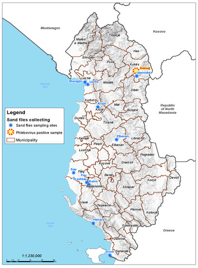 - Ayhan, N.; Velo, E.; de Lamballerie, X.; Kota, M.; Kadriaj, P.; Ozbel, Y.; Charrel, R.N.; Bino, S. Detection of Leishmania infantum and a Novel Phlebovirus (Balkan Virus) from Sand Flies in Albania. Vector-Borne Zoonotic Dis. 2016, 16, 802–806. [Google Scholar] [CrossRef] [PubMed]