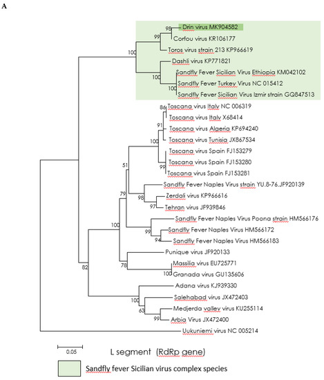 - Alkan, C.; Moin, V.V.; Ayhan, N.; Badakhshan, M.; Bichaud, L.; Rahbarian, N.; Javadian, E.A.; Alten, B.; de Lamballerie, X.; Charrel, R.N. Isolation and sequencing of Dashli virus, a novel Sicilian-like virus in sandflies from Iran; genetic and phylogenetic evidence for the creation of one novel species within the Phlebovirus genus in the Bunyaviridae family. PLoS Negl. Trop. Dis. 2017, 11, 1–22. [Google Scholar] [CrossRef] [PubMed]