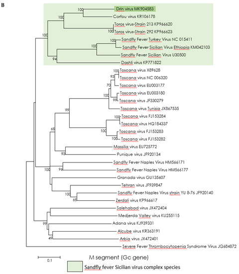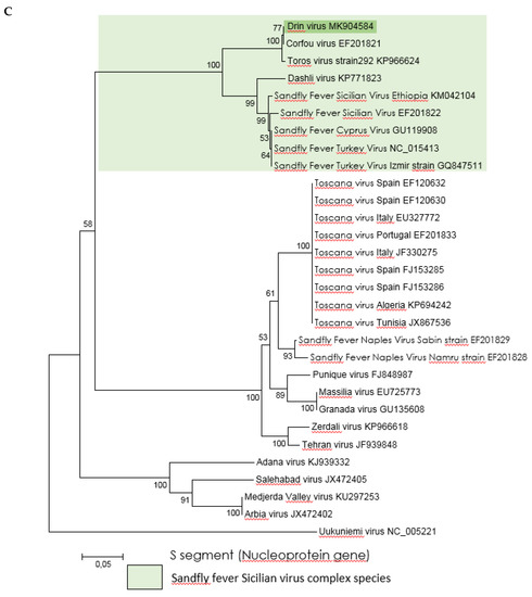 The viruses belonging to the SFSV and CFUV tentative phlebovirus species have previously been described in Italy, Turkey, Cyprus, Greece, Iran, and Ethiopia, but they have never been detected in Albania or the other countries of the Western region of the Balkans [1,3,23,24,25,26]. Although SFSV and CFUV viruses were respectively discovered in 1943 and 1985, both remained classified as tentative species within the genus Phlebovirus. Recently, the isolation of the Dashli virus in Iran has been an opportunity to propose to group SFSV, CFUV, and Dashli viruses within a single species putatively named Sandfly fever Sicilian phlebovirus species [3].