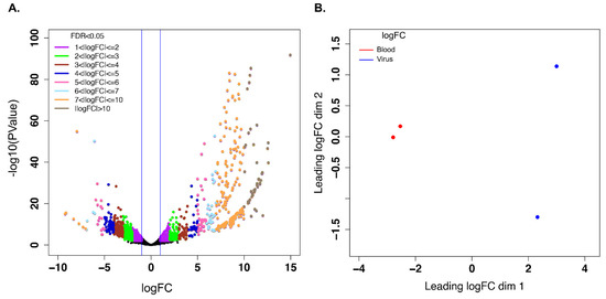 Visualization of differential gene expression analysis using edgeR. (A) Represents the volcano graph derived by plotting the log of the FDR-adjusted p value as a function of Log2 of the fold change (“logFC”) for each transcript in EHDV-fed midges vs. controls. (B) Represents the multidimensional scaling plot of the relationship matrix which is derived from Log2 fold change of the differentially-expressed unigenes across the sample groups showing separation of controls vs. EHDV-fed groups.