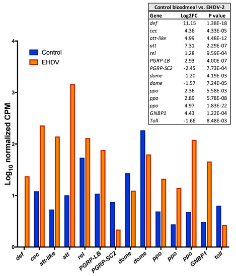 Innate immune genes that were differentially-expressed after EHDV-2 infection in the midge. Control midges were fed blood with sterile virus media and EHDV-2 midges were fed blood with virus in media (n = 15 per replicate, 2 replicates). Data were captured at 36 h post-ingestion for whole midges. 10-log CPM (Counts Per Million mapped reads) represents relative expression across conditions (normalized for two replicates). All unigenes shown were differentially expressed between the two conditions (p < 0.05). Log2FC and actual p values are shown in inset table with further details between the two conditions available in Table S2. def, defensin (m.9997); cec, cecropin (m.10000); att-like, attacin-like (m.3410), att, attacin (m.7821), rel, relish (m.58438), PGRP-LB, peptidoglycan recognition protein LB (v.751); PGRP-SC2, peptidoglycan recognition protein SC2 (m.9236); dome, dome cytokine receptor (paralogs: m.63662; m.64065); ppo, prophenoloxidase (paralogs: m.21464, m.5965, m.41748); GNBP1, Beta-1,3-glucan-binding protein-1 (m.20067); toll, toll receptor (m.9915).