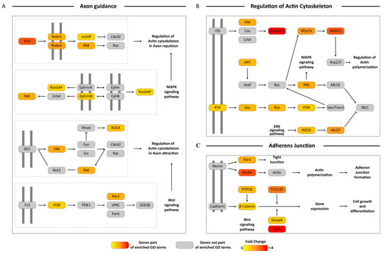 Pathway visualization using downregulated differentially-expressed unigenes in Axon guidance, Regulation of actin cytoskeleton and Adherens junction. Transcripts from enriched Gene Ontology (GO) terms from the downregulated unigene set were mapped on to KEGG Axon guidance pathway (A), Regulation of actin cytoskeleton (B) and Adherens junction (C) pathways and visualized manually. Boxes in color represent protein coding genes that were present within the enriched GO terms. The gradient of the color represents their fold change. Grey boxes represent protein coding genes not present in the enriched GO terms. Dotted lines represent individual modules within the parent pathway. Pathway components present on double grey lines represent cell membrane receptors. Log2FC differences between the two conditions can be referenced in Table S2.