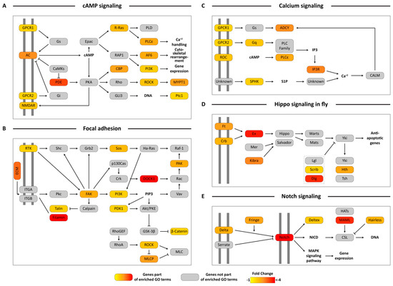 Pathway visualization using downregulated differentially-expressed unigenes in cAMP signaling, Focal adhesion, Calcium signaling, Hippo signaling in fly and Notch signaling. Transcripts from enriched Gene Ontology (GO) terms from the downregulated unigene set were mapped on to KEGG cAMP signaling (A), Focal adhesion (B), Calcium signaling (C), Hippo signaling in fly (D) and Notch signaling (E) pathways and visualized manually. Boxes in color represent protein coding genes that were present within the enriched GO terms. The gradient of the color represents their fold change. Grey boxes represent protein coding genes not present in the enriched GO terms. Pathway components present on double grey lines represent cell membrane receptors. Log2FC differences between the two conditions can be referenced in Table S2.