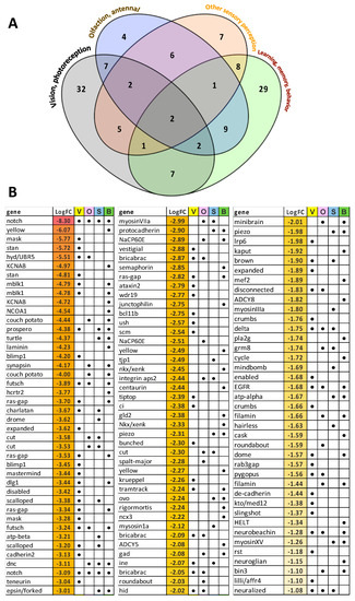 Unigenes associated with sensory processes, behavior, learning and memory that were significantly downregulated in EHDV-2 infected midges. Differentially-expressed unigenes were manually inspected, catalogued and categorized to present sets associated with sensory processes (vision, olfaction, other) and brain functions (learning, memory, behaviors). (A) 122 unigenes were downregulated with EHDV-2 infection: 62 associated with vision, 35 associated with olfaction, 32 other sensory functions (e.g., gustatory, touch), 59 brain functions. (B) Log2FC in expression of unigenes associated with vision (V), olfaction (O), other sensory (S) and brain functions (B) are given. As both panels indicate, many of these unigenes have overlapping functions. Further details including functional roles for each unigene can be found in Supplementary Table S8.