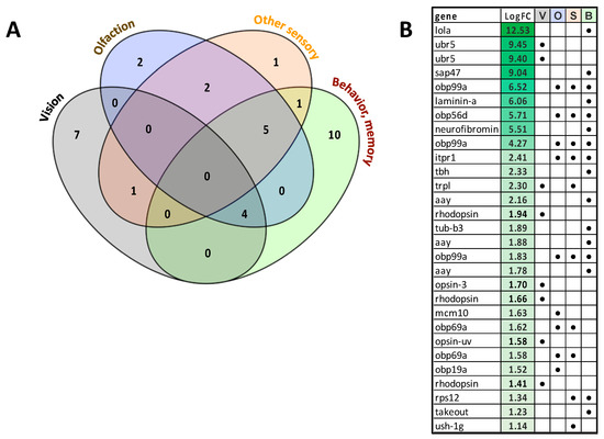 Unigenes associated with sensory processes, behavior, learning and memory that were significantly upregulated in EHDV-2 infected midges. Differentially-expressed unigenes were manually inspected, catalogued and categorized to present sets associated with sensory processes (vision, olfaction, other) and brain functions (learning, memory, behaviors). (A) Of the 29 unigenes that were upregulated with EHDV-2 infection: 8 associated with vision, 9 associated with olfaction, 10 associated with other sensory functions (e.g., gustatory, touch), and 16 to brain, memory and/or learning. (B) Log2-FC in expression of unigenes associated with vision (V), olfaction (O), other sensory (S) and brain functions (B) are given. As both panels indicate, many of these unigenes have overlapping functions. Further details including functional roles for each unigene can be found in Supplementary Table S8.