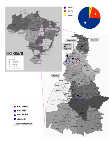 Location of PeV-A strains detected in Brazil. The map of Brazil is shown at the top of the figure to illustrate the region (magenta rectangle) in Tocantins state where samples were collected. A diagram shows the proportions of genotypes detected in this study (top-right). The magnified image of the region shows the cities (indicated by arrows) and the location of each PeV-A isolate. Distinct recombinant strains are represented by different shapes, as is indicated in the panel (bottom-left). Colors indicate distinct PeV-A genotypes. The blue arrows indicate the city (Salvador) where PeV-A strains were detected previously in Brazil.