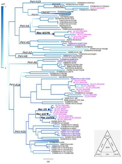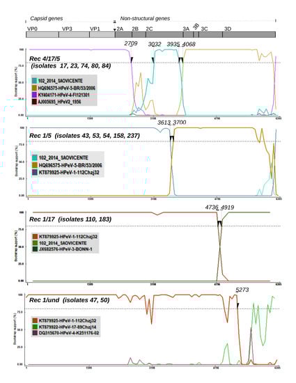We proceeded to identify chimeric PeV-A genomes. Initially, 98 reference sequences were analyzed to identify non-recombinant strains to be used as “parental” strains. The strains KT879919 (PeV-A2); KT879918 (PeV-A5); FJ888592 (PeV-A6); JX682576 (PeV-A3); KY404171 (PeV-A4); and KT879922 (PeV-A1) were used as parental references in the following analysis. We also excluded strains #021, #065, and #175 since they were of poor quality and could reduce reliability of the analysis. Next, we screened a dataset composed of the parental references and Brazilian PeV-A strains. In addition to the strains generated in this study, the alignment used also contained other Brazilian strains, as follows: EU716175 (PeV-A8-BR/217); HQ696577 (PeV-A6-BR/104); HQ696576 (PeV-A5-BR/77); HQ696575(PeV-A5-BR/53); HQ696572 (PeV-A1-BR/30) HQ696571 (PeV-A1-BR/27); HQ696574 (PeV-A1-BR/145); HQ696570 (PeV-A1-BR/21); and HQ696573 (PeV-A1-BR/114). This allowed us to detect many recombinant PeV-As (i.e., 17, 23, 43, 47, 50, 53, 54, 74, 80, 84, 110, 158, 183, and 237) among the sequences generated. These recombinant strains are fully characterized in the next section.