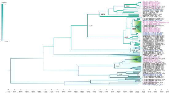 - Rambaut, A.; Drummond, A.J.; Xie, D.; Baele, G.; Suchard, M.A. Posterior summarization in bayesian phylogenetics using tracer 1.7. Syst. Biol. 2018, 67, 901–904. [Google Scholar] [CrossRef] [PubMed]
