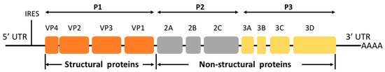 The genome of EV-D68 contains a positive-sense single-stranded RNA of about 7.6 kb. Like other picornaviruses, EV-D68 consists of a single open reading frame (ORF) flanked by untranslated regions (UTR) at each end [8], encoding a precursor polyprotein that is further cleaved autocatalytically to yield four structural proteins (VP1, VP2, VP3, and VP4) and seven non-structural proteins (2A, 2B, 2C, 3A, 3B, 3C, and 3D) (Figure 1) [8]. VP1, which contains the serotype-specific neutralization BC loop site, is used to distinguish among virus serotypes and to detect newly emerging strains [9]. Viral protein 2C has been reported to play an important role in the processes of infection and viral-host interaction, making it a promising target for anti-EV-D68 drugs. The selective serotonin reuptake inhibitor fluoxetine (Prozac) inhibits human enterovirus by targeting protein 2C and interfering with viral RNA replication [10]. However, fluoxetine has proven to be ineffective in improving the neurologic outcomes of EV-D68-associated AFM in a clinical trial [11]. Recently validated as a novel antiviral target, 2Apro is potently inhibited by telaprevir, an FDA-approved drug used for the treatment of hepatitis C virus infection [12]. The 3C protease contributes to the life cycle of viral infection and replication by inhibiting host innate immune responses; thus, it is also a potential target for antiviral drugs [13,14,15].