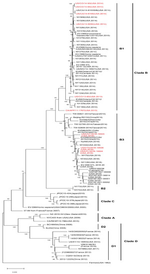 - Wang, G.; Zhuge, J.; Huang, W.; Nolan, S.M.; Gilrane, V.L.; Yin, C.; Dimitrova, N.; Fallon, J.T. Enterovirus D68 Subclade B3 Strain Circulating and Causing an Outbreak in the United States in 2016. Sci. Rep. 2017, 7, 1242. [Google Scholar] [CrossRef]