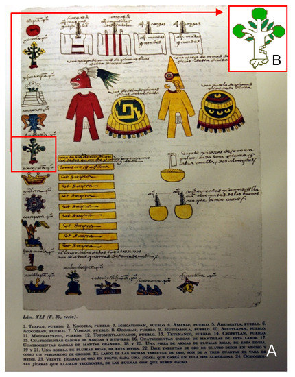 Mesoamerica is considered the center of origin of the avocado, principally the highlands of México and Guatemala [1]. The oldest avocado fossils, dating back more than 8000 years ago [2], were found in the Caves of Coxcatlán, in the Tehuacán Valley of the State of Puebla, México. Human pilgrimages extended it to the South of México and North of Central America, down to Colombia, Venezuela, Ecuador, and Perú [3]. Ahuacatl (aguacate) in the Nahuatl language means “testicle”, from the shape of the fruit. Domesticated avocado seeds were found buried with Incan mummies in Perú dating back to 750 B.C., and there is evidence that avocados were cultivated in México as early as 500 B.C. [4]. The Mendoza Codex was painted by Mexican painters with the intent by México’s first virrey, Antonio de Mendoza, to send it to Carlos I, King of Spain (also Charles V of the Holy Roman Empire). This codex is a pictographic script, which in the first chapter describes life in México from 1325 (the foundation of Tenochtitlan, the great Mexica Empire Capital) to the arrival of the Spanish invasion (1521). The second chapter lists all the towns in Mexica´s domain and the tributes they should periodically deliver. The folio (page 39) lists 14 towns, the fifth of which (from the top left) is Ahuacatlan, represented by an avocado tree (Figure 1). The teeth drawing on the trunk means “place”, and Ahuacatlan means “place where aguacate (avocado) grows”. There are several Ahuacatlan towns in the States of México, Nayarit (Ahuacatlan), and Puebla, and in Guatemala and Colombia. The 14th month in the Mayan calendar (K’ank’in) is represented by an avocado glyph [3]. During the reign of Carlos I, the Crown of Spain (Castilla) expanded its territories over much of America, and avocado was probably spread during this expansion: Hernán Cortés conquered the Mexica Empire in 1521, which would result in the Kingdom of New Spain (Spaniards tried avocados for the first time), and Nuño de Guzmán conquered the Tarascan Empire and founded the Kingdom of Nueva Galicia. The first written document that mentions aguacate is by Francisco Fernández de Enciso, who found and tasted aguacate in Yaharo, close to Santa Marta, Colombia. He described the fruit: “it looks like an orange and the pulp is yellow, like butter with a delicious, soft and marvelous taste” [3]. Palta is another name in Spanish used in South America for aguacate. Pedro de Cieza described in 1532–1550 the presence of avocado in several countries. He mentioned aguacate as the fruit that belongs to Panama. Then, he mentioned it as palta in Colombia (Cártago, Cali, and Cauca Valley) and Ecuador. Garcilaso de la Vega in “Comentarios regios de los Incas” mentioned Tupac Inco Yupanqui advancing and conquering several towns (1450–1475), one of which was Palta, mentioning that exquisite fruit named palta. This is the approximate time when the palta tree was brought from Ecuador to Perú. In Europe, the avocado was first mentioned by Clusius, who referred to avocado trees of a Mexican type growing in Valencia, Spain. Now, avocados are cultivated and consumed on the five continents of our planet [3].