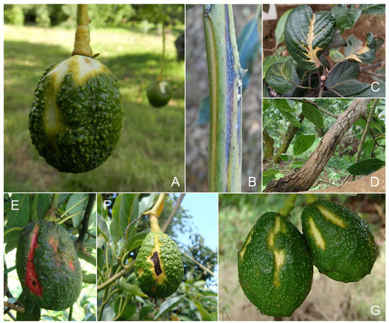 Symptoms of avocado sunblotch disease. Yellowish sunken areas on fruits (A); discolored and necrotic depressions on infected twigs (B); distortion and variegation on leaves (C); cracked bark (“Alligator skin”) appearance on some mature branches (D); fruits with reddish color areas (E); necrosis on severely affected fruits (F); multiple yellowish sunken areas in fruits (G).