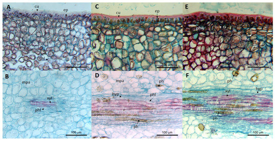 Cross-sectional micrographs of the exocarp and mesocarp tissues of avocado fruits infected with the avocado sunblotch viroid (ASBVd): (A,B) Asymptomatic; (C,D) yellowish sunken spot and (D,E) yellowish sunken crack. Cuticle (cu), epidermal cells (ep), exocarp parenchyma (epa), mesocarp parenchyma (mpa), chloroplasts (chl), phloem cells (phl), xylem vessels (xyl), phenol accumulation in cell wall (phw), hypertrophy (hyp), accumulation of red inclusions (ri), and necrotic cells (nc).