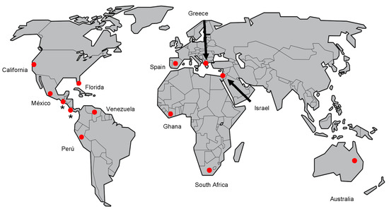 Geographical distribution of ASBVd in the five continents: America (USA, Venezuela, Perú, México), Europe (Spain, Greece), Asia (Israel), Africa (Ghana, South Africa), and Australia. 1. California 1928, 2. Florida 1939, 3. Australia 1970, 4. Venezuela 1976, 5. South Africa 1983, 6. Israel 1984, 7. Spain 1987, 8. Perú 1991, 9. Ghana 2008, 10. México 2009, 11. Greece 2018. The updated status of ASBVd in the different countries based on EPPO (2016) and Lotos et al. [65] are as follows: United States—Present, no details; Australia—Present, no details; Venezuela—Present, no details; South Africa—Present, widespread; Israel—Present, restricted distribution; Spain—Present, no details; Perú—Present, restricted distribution; Ghana—Present, few occurrences; México—Present, restricted distribution; and Greece—Present, no details. * No official reports in Guatemala or Costa Rica.
