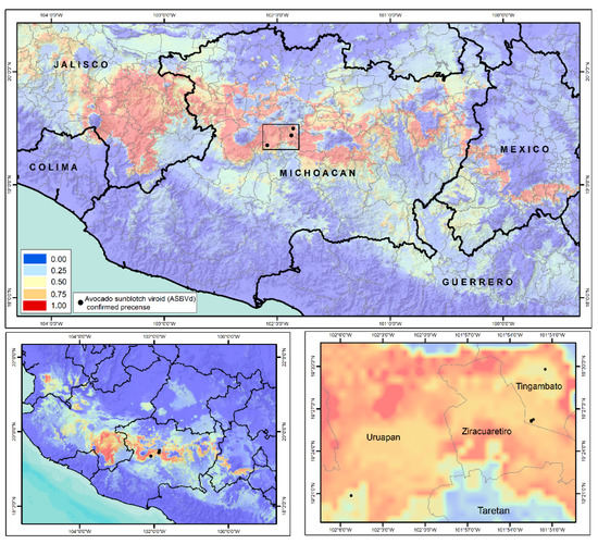 The actual status of ASBVd in México is considered as “Present, Restricted Distribution” [55] according to the ISPM No. 8 “Determination of pest status in an area” [66]. Recent reports confirmed the presence of ASBVd in the Michoacán State in orchards located in the Tingambato Municipality (four orchards) [17,28,67] and Uruapan Municipality (one orchard) [26,54,68]. Michoacán and Jalisco are the principal states which make up the geographic region where the “Hass” avocado is cultivated (avocado belt), and the area shows high entropy values (Trans-Mexican Volcanic Belt) for the establishment of avocado, so it is important to implement major measures to prevent viroid dispersion [67] (Figure 5).