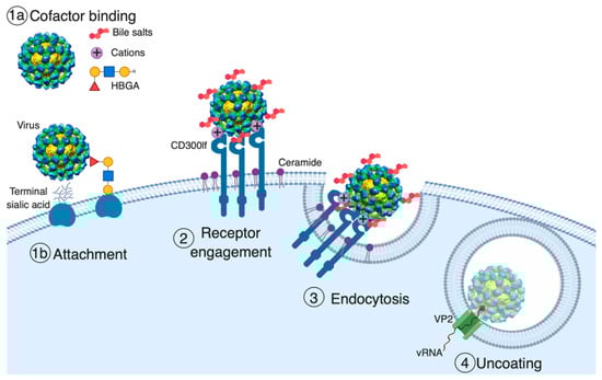 Non-enveloped virus entry is a multi-step process starting with viral attachment to target cells, followed by receptor engagement, endocytosis, cell membrane penetration, and uncoating that culminates in the delivery of the viral genome into the cytoplasm [] (Figure 1). Notably, viral entry is a critical determinant of cell tropism, host range, and pathogenesis. The first and often rate-limiting step of viral entry is virus binding to host cells, which is mediated by both host attachment factors and receptors. Attachment factors are host molecules that concentrate the virus on the cell surface but do not actively induce viral entry []. While attachment factors increase the efficiency of viral infection, they are by definition not essential. In contrast, viral receptors are essential host molecules that specifically bind the virus particle, induce a conformational change in the virus, and actively promote viral entry []. Notably, in some cases, the classification of host molecules involved in viral entry can be dependent on viral strain, host cell type, and culture conditions. Interestingly for noroviruses, both cell-associated and non-cell-associated host molecules that augment binding, albeit by diverse mechanisms, have been described. These molecules include the attachment factors histo-blood group antigens (HBGAs), bile acids, sialic acid, and divalent cations (Figure 1) [,,,,,,].