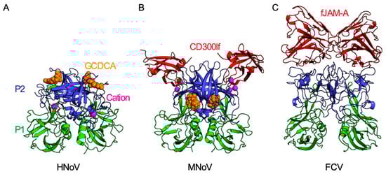 Molecular interactions of calicivirus capsid proteins. Each calicivirus has T = 3 icosahedral symmetry and is comprised of 90 VP1 dimers. Each VP1 capsid monomer is comprised of a shell (S) and a protruding (P) domain. The P domain is further subdivided into an apical P2 domain (blue) and a P1 domain (green) which connects the more variable P2 to the shell domain. (A) The secondary bile salt glycochenodeoxycholic acid (GCDCA; shown as orange space-filling model) binds to the apical region of the P2 domain of human norovirus (HNoV) GII.10 (PDB ID: 6GW1) []. This binding site partially overlaps with the HBGA binding site on HNoVs (not shown). (B) MNoV P2 binds the CD300lf receptor (red) at 1:1 stoichiometry (PDB IB: 6E47). Both cations (magenta) and GCDCA (orange) enhance binding of MNoV to CD300lf. GCDCA binds MNoV VP1 at the dimer interface between the protruding domains, a site different from the GCDCA-binding site on HNoV GII.10 [,,]. (C) The apical region of FCV capsid P2 domain binds the FCV receptor fJAM-A (PDB ID: 6GSI). Similar to CD300lf, fJAM-A is an Ig domain-containing membrane protein and binds the P2 domain at 1:1 stoichiometry. While the CD300lf ectodomain is comprised of a single Ig domain, fJAM-A has two Ig domains (D1 and D2) with only the distal D1 domain directly binding the FCV P2 domain [].