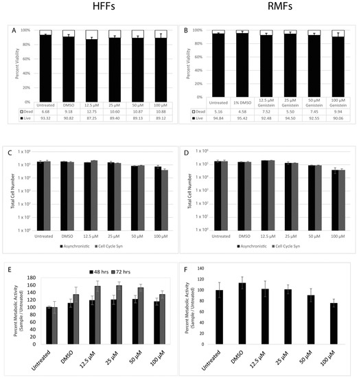 Cytotoxicity of genistein in human foreskin fibroblasts (HFFs) and Rhesus macaque foreskin fibroblasts (RMFs). Cells were left untreated (negative control) or treated with either 0.1% dimethyl sulfoxide (DMSO) (experimental control) or increasing concentrations of genistein. After 48 h, HFFs (A) and RMFs (B) were collected and assayed for live vs. dead cells via trypan blue dye exclusion. HFFs (C) and RMFs (D) were kept as an asychronous population or growth was synchronized via overnight serum-starvation prior to genistein treatment. Cells were collected and the total cell numbers counted after 48 h. HFFs (E) and RMFs (F) were serum-starved overnight, then genistein-treatments were added and cells were incubated for 48 h (E) or 72 h (E,F), and then assayed for metabolic activity via MTS assay. For A–F, n = 9, with the statistical analysis performed via one-way ANOVA with Dunnet’s correction for multiple comparisons.