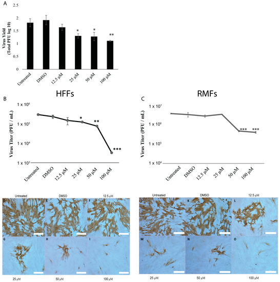 Genistein has antiviral activity against B virus in human and macaque fibroblasts. HFFs and RMFs were left untreated (negative control) or treated with either 1% DMSO (experimental control) or increasing concentrations of genistein and infected with 150 PFU of B virus for 48 h. (A) Indirect virus yield assay in HFFs. After 48 h, cells/supernatants were harvested and back-titered on Veros. Data shows total PFU counted in Veros. Cell-based Elisa in HFFs (B) and RMFs (C). After 48 h, cells were fixed with 100% methanol and assayed via ELISA for amount of virus antigen. An in-assay standard curve was generated to calculate virus titer and IC50 values were calculated using a logarithmic regression line. Statistical analysis performed via one-way ANOVA with Dunnet’s correction for multiple comparisons. N = 9. Error bars show standard error of the mean. * p = <0.05, ** p < 0.01, *** p =< 0.001. Direct virus yield assay in HFFs (D–I) and RMFs (J–O). After 48 h, cells were fixed with 100% methanol and virus antigen was visualized via IHC with DAB detection. Scale bars shown at 200 µM.3.3. Genistein Targets B Virus Post-Viral Entry and Genomic Replication.