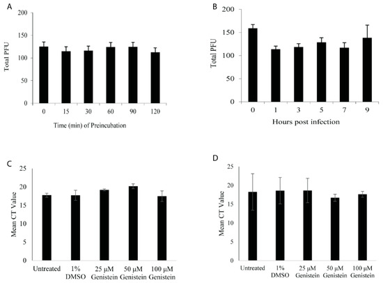 B virus’ life cycle is ordered into three distinct phases of virus gene transcription/translation: Immediate-early (IE), early (E), and late (L), wherein each phase is dependent on the previous. The full replicative cycle is ~12 h in Vero, with IE genes expressed by 2 hpi, E genes expressed between 2–4 hpi and followed by genomic replication, and L gene synthesis up to 8 hpi. From 8–12 hpi, virions are assembled, glycoproteins undergo glycosylation, and virions are released from the infected cell. To look at the effect of genistein at all phases of the viral life cycle, we added 50 μM genistein at 1, 3, 5, 7, and 9 hpi. There was no difference in virus replication at any time point (Figure 3B). Further, there was no statistically significant difference when genistein was added at the same time as B virus (data not shown; Figure 4C), suggesting that genestein does not impact viral entry. To verify that HFF and RMF would behave in a similar fashion, DNA was isolated from cells infected with increasing concentrations of genistein. No significant difference in the total viral DNA levels in infected cells at any concentration was found (Figure 3C,D). Collectively, these data suggest genistein targets a viral event post-genomic replication and L gene synthesis and, further, that this is not a species-dependent mechanism.