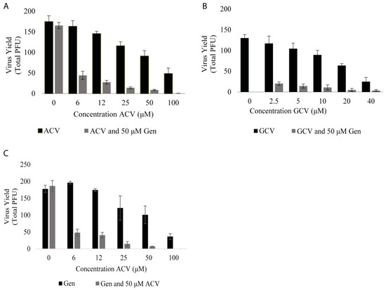 Genistein acts synergistically with antiviral agents to reduce effective dose. (A) and (B) show the results of virus yield assays, wherein Vero cells were infected with 150 PFU of B virus and 50 μM of genistein with increasing concentrations of ACV (A) or GCV (B). (C) Vero cells were infected with 150 PFU of B virus and 50 μM ACV with increasing concentrations of genistein. Total PFU was determined by standard plaque assay.