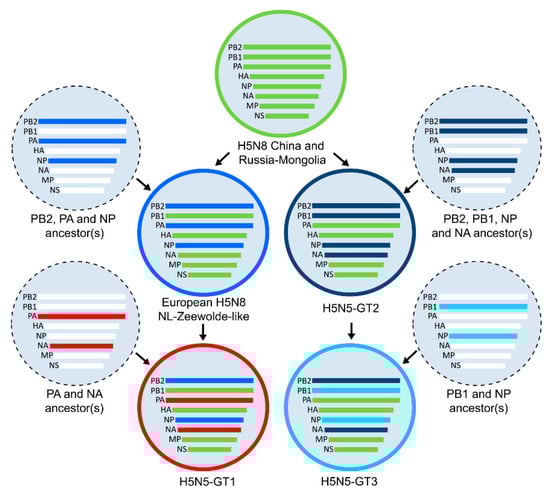 Gene constellations of HPAI H5N5 genotypes. Schematic representation of reassortment events that resulted in the emergence of three highly pathogenic avian influenza (HPAI) H5N5 genotypes detected during the HPAI H5 2016-2017 epidemic (H5N5-GT1, H5N5-GT2 and H5N5-GT3). Novel genes were obtained by reassortment of HPAI viruses with co-circulating low pathogenic avian influenza (LPAI) ancestor viruses. Gene segments are colored according to their phylogenetic cluster, as shown in Figure S1. PB2, polymerase basic protein 2; PB1, polymerase basic protein 1; PA, polymerase acidic protein; HA, hemagglutinin; NP, nucleoprotein; NA, neuraminidase; MP, matrix protein; NS, nonstructural protein.
