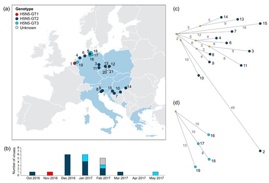 Spatiotemporal distribution and phylogenetic network analysis of HPAI H5N5 genotypes. (a) Map of Europe showing the geographical distribution of highly pathogenic avian influenza (HPAI) H5N5 viruses isolated during the HPAI H5 2016–2017 epidemic, with countries reporting HPAI H5N5 virus infection (blue) and the collection locations of HPAI H5N5 viruses, colored by genotype. (b) Number of HPAI H5N5 viruses isolated during the HPAI H5 2016–2017 epidemic per month, colored per genotype. (c) Median-joining network analysis of viruses belonging to genotypes H5N5-GT2. (d) Median-joining network analysis of viruses belonging to genotype H5N5-GT3. The number of nucleotide substitutions between strains are shown as values near branches. Detailed information on the virus sequences is provided in Table S2.