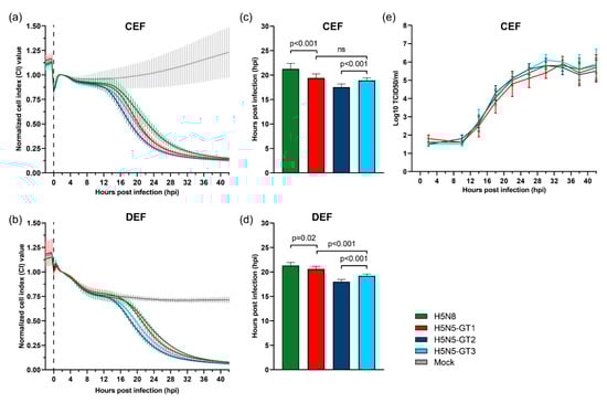 We performed real-time cell analysis to determine the cytopathogenicity of HPAI H5N5 and H5N8 viruses in primary cultures of embryonic fibroblasts of chickens (CEF) and ducks (DEF). The cells were inoculated with viruses representing genotypes H5N5-GT1, H5N5-GT2, H5N5-GT3 and European H5N8 NL-Zeewolde-like virus (Table S4), and CPE was monitored by measuring the electrical impedance of the cell monolayer, which is expressed as the CI value. A decrease in CI value was observed between 10–12 hpi in inoculated CEF cells and between 12–14 hpi in inoculated DEF cells, marking the onset of virus-induced cytopathogenicity (Figure 3a,b). The CPE observed in the inoculated cultures increased over time, and resulted in complete cell death within 42 hours.