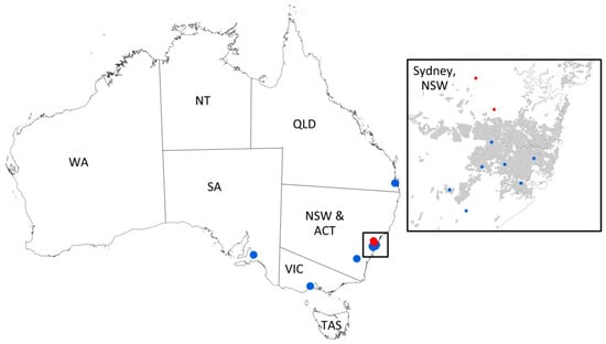 Map of Australia, showing the location of the veterinary hospitals (Group 1; blue dots) used to recruit cats from all Australian States and Territories except WA, NT, and TAS, and the location of the two rescue facilities in Sydney, NSW (Groups 2 and 3; red dots). An enlargement of Sydney and its surrounding areas is shown in the breakout box. The grey shading in the breakout box represents the ‘Built Up Areas’ of Sydney (as defined by Geosciences Australia, http://www.ga.gov.au/mapspecs/250k100k/appendixA_files/Habitation.html#Habitation Built Up Area Polygon) and is included to show the semi-rural location of the two rescue facilities and one veterinary hospital on the outskirts of Sydney. ACT = Australian Capital Territory, NSW = New South Wales, NT = Northern Territory, QLD = Queensland, SA = South Australia, TAS = Tasmania, VIC = Victoria, WA = Western Australia.