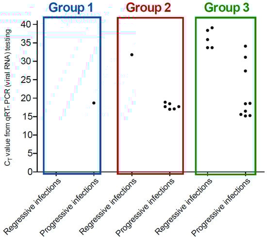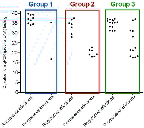 EDTA-anticoagulated samples were available from all 529 cats for qPCR testing. Presumptively progressively-infected cats demonstrated significantly lower median qPCR CT values (median 21, geometric mean 23, range 17–37, IQR 18–29) compared to presumptively regressively-infected cats (median 35, geometric mean 35, range 28–40, IQR 33–37; p < 0.001; Mann–Whitney U-test). There was some overlap of qPCR CT values between presumptively regressively and progressively-infected cats (Figure 2) and five presumptively progressively-infected cats (one in Group 1 and four in Group 3) had low proviral loads (CT values > 30).