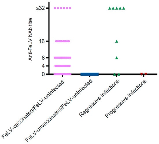 Results from these analyses enabled classification of cats as FeLV-uninfected or FeLV-infected, using the following definitions (Table 1). FeLV-uninfected cats included FeLV-unexposed cats (p27-negative, qPCR-negative, NAb-negative) and FeLV-abortive infections (p27-negative, qPCR-negative, NAb-positive). FeLV-infected cats included cats with a ‘presumptively regressive infection’ (p27-negative, qPCR-positive, NAb negative or positive) and cats with a ‘presumptively progressive infection’ (p27-positive, qPCR-positive, NAb negative or positive). FeLV-vaccinated cats uncommonly produce NAb following vaccination without exposure [26,27,28], and instead, FeLV vaccination is thought to ‘prime’ the immune system and boost the NAb response following exposure [7]. Consequently, FeLV-vaccinated/FeLV-uninfected cats that tested NAb-positive were considered FeLV-vaccinated cats that had come into contact with the virus and were classified as ‘presumptively abortive infections’ (versus FeLV-unvaccinated/FeLV-uninfected cats that tested NAb-positive and were considered as ‘definitively abortive infections’). ‘Presumptively’ regressive and progressive infections were described because, in the absence of repeated testing, a transient viraemia may have been present in some cats, resulting in some regressive infections being incorrectly classified as progressive infections [1,2,29]. Detection of vRNA by qRT-PCR testing was not included in the definition for progressive infections, as has been suggested elsewhere, since residual plasma was not available from all FeLV-infected cats for testing [17,29].
