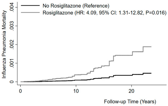 NHANES participants were asked about medication use in the past month. Those who reported taking prescription medications were further asked about the name and duration of the product used. The product name was recorded preferentially from the medication container label and if the container was unavailable, it was reported by the participant. The medications we included were rosiglitazone, other thiazolidinediones, insulin, and other oral antidiabetic drugs (metformin, sulfonylureas, other antidiabetics). Influenza/pneumonia mortality was defined using the Tenth Revision of the International Classification of Diseases (ICD-10) (corresponding to the codes J9-J18). Detailed information on the classifications used by the NHANES is available at https://www.cdc.gov/nchs/data/datalinkage/public-use-2015-linked-mortality-files-data-dictionary.pdf. Using a questionnaire, the NHANES also collected data on covariates including age, gender, race/ethnicity, family poverty income ratio (PIR), cigarette smoking, and previous diagnosis of asthma or COPD.