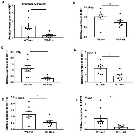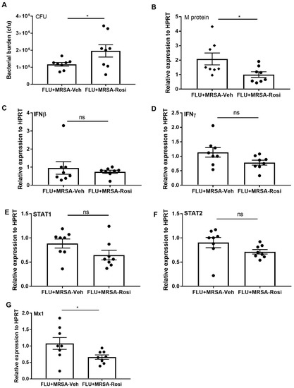 Influenza induces Type I, Type II, and Type III interferons, which are responsible for interfering with viral replication in infected cells [1,2,3,4,5]. Binding of Type I interferons to their transmembrane protein receptors results in the formation of STAT1–STAT2 heterodimers, while binding of Type II interferons signal through STAT1–STAT1 homodimers, translocate into the nucleus, and sub-sequentially bind to the promoter element of interferon stimulated genes (ISG) to control the virus [6,7]. Mx proteins are interferon-induced GTP binding proteins that are part of the type I and type III IFN-induced antiviral response [8]. Mx1, inhibits influenza viral transcription and replication by suppressing the polymerase activity of viral ribonucleoproteins [9]. Influenza infection induces a variety of inflammatory cytokines and chemokines such as IL-6, IL-8, TNFα, CCL2, CCL5, CXCL10, and recruitment of neutrophils and macrophages to clear the virus. Neutrophil elastase (ELANE) and cathepsin G (CTSG) are proteolytic enzymes present in neutrophilic azurophilic granules that are involved in antimicrobial activity [10,11]. However, excessive inflammatory immune responses from neutrophils, macrophages and proinflammatory cytokines drive lung pathology [1,12]. Although most influenza infections result in mild to moderate disease, secondary bacterial infection results in high rates of mortality and morbidity. Community-acquired methicillin-resistant Staphylococcus aureus (MRSA) has been shown as a significant source of mortality during influenza-associated secondary bacterial infection [13,14,15]. Influenza infection predisposes the lung to secondary bacterial infection by dysregulation of innate and adaptive immune responses [16,17,18,19,20,21,22]. We have shown that type I IFN and STAT1 inhibit the S. aureus-induced Type 17 response, thereby decreasing bacterial clearance during influenza-bacterial super-infection [23,24,25]. Also, our recent study has shown that the STAT2 signaling suppress macrophage activation and bacterial clearance during influenza-bacterial super-infection [26]. Given the mortality associated with influenza and influenza-bacterial super-infection, research has focused on identification of therapeutic targets.