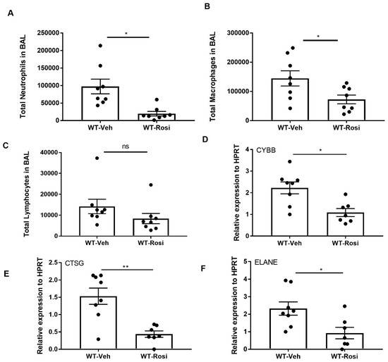 Next, to examine the inflammatory response, we stained cells from bronchoalveolar lavage (BAL) and performed differential counting. We found decreased neutrophil and macrophage cells in the BAL of rosiglitazone-treated mice when compared to the vehicle-treated controls (Figure 4A,B). Further, the number of lymphocytes also trended to decrease in rosiglitazone-treated mice when compared to controls (Figure 4C). Next, we determined the effect of rosiglitazone treatment on neutrophil activity by measuring the gene expression of cytochrome B (CYBB), cathepsin G (CTSG and neutrophil elastase (ELANE). We found decreased expression of these genes in response to rosiglitazone treatment (Figure 4D–F). These findings are consistent with PPARγ agonist impairment of inflammation.