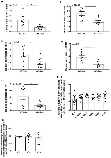 Rosiglitazone treatment decreases the level of inflammatory cytokines and chemokines during influenza infection. WT male, 6–8 weeks old mice were infected with 100 pfu of influenza (N = 7–8 per group). Mice were treated with rosiglitazone or vehicle (DMSO) from day 0–6 post-infection and harvested on day 7 post-infection. (A–E) IL-6, IL-12p40, CCL2, CXCL9 and CXCL10 expression levels were measured by RT-PCR, N = 7–8 per group. Relative induction of (F) IL-6, IL-12p40, IL-12p70, CCL2, CCL3, and CCL4 (G) IL-4, IL-10, and IL-13 levels in response to rosiglitazone-treated to vehicle-treated group by Luminex assay N = 7–8 per group, Data are represented as mean ± SEM, * p < 0.05, ns-not significant.