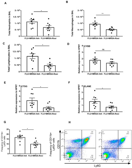 Next, we determined the inflammatory cellular response in the airspace by measuring the number of neutrophils, macrophages and lymphocytes in BAL. We found decreased numbers of neutrophils, macrophages and lymphocytes in super-infected, rosiglitazone-treated mice when compared to super-infected, vehicle-treated mice (Figure 7A–C). Further, we determined whether neutrophil activity is decreased in response to rosiglitazone treatment. We found decreased expression of CTSG and ELANE in super-infected, rosiglitazone-treated mice when compared to super-infected, vehicle-treated mice (Figure 7D–F). We also found a decreased percentage of neutrophils in the lung by flow cytometry (Figure 7G,H). These data suggest that rosiglitazone treatment decreases the cellular response to bacterial super-infection by reducing neutrophil numbers and activity during influenza-bacterial super-infection.